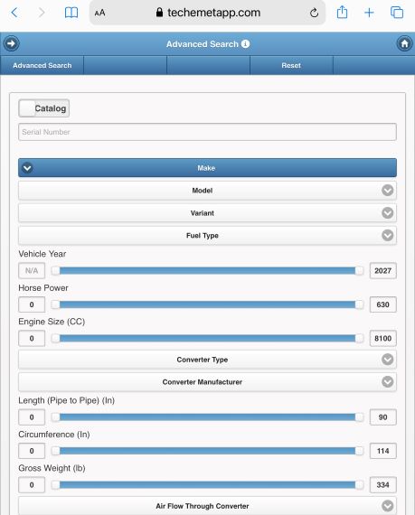The Advanced Search feature allows you to search for a converter using a number of search criteria which describe the physical characteristics of a converter.