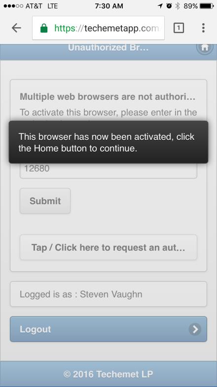 You have submitted the auth. code you have now authorized your app. You can now select the home button and return to the main page.