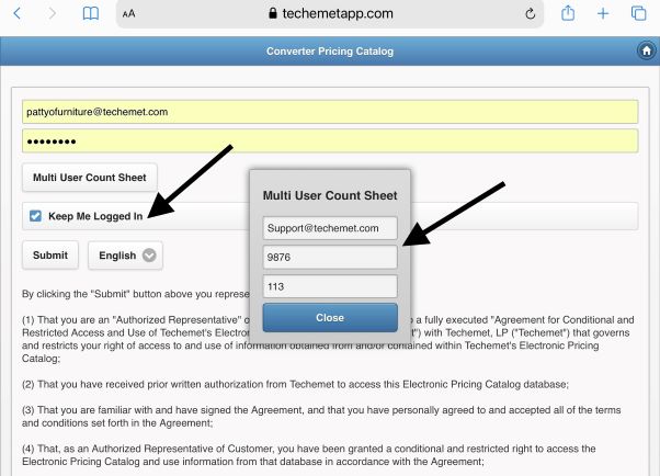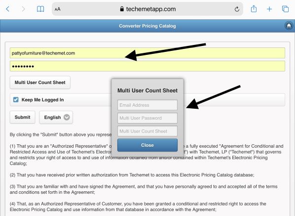 In this example Pattyofurniture@techemet.com (the recipient of the Multi User Count Sheet password) logs in as follows: